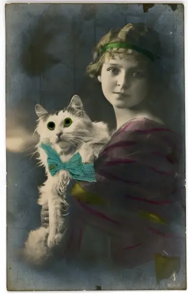 Stoff Ak Mädchen-Portrait, Katze mit Plastikaugen, Stoff-Schleife