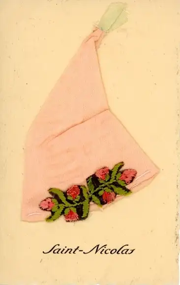 Stoff Ak Sankt Nicolas, Mütze, Kitsch, Gestickte Blumen