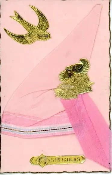 Stoff Ak Sankt Nicolas, Mütze, Kitsch, Schwalbe, Herzen