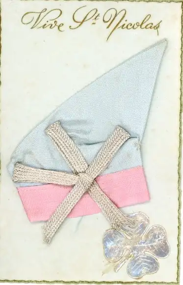Stoff Ak Sankt Nikolas, Mütze, Kitsch, Glücksklee, Schleife