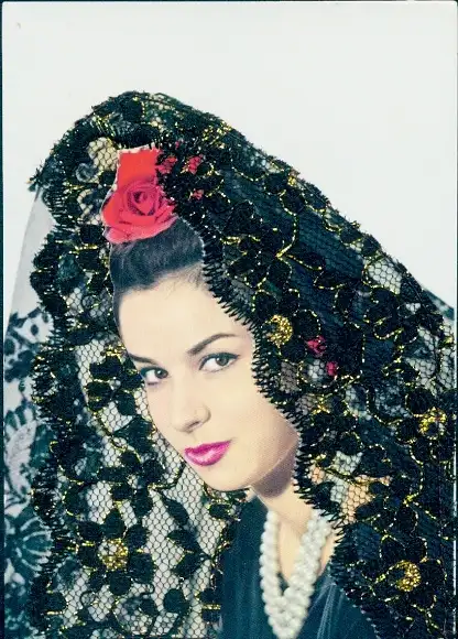 Stoff Ak Spanische Tracht, Frau-Portrait, Perlen, Schleier, Rose