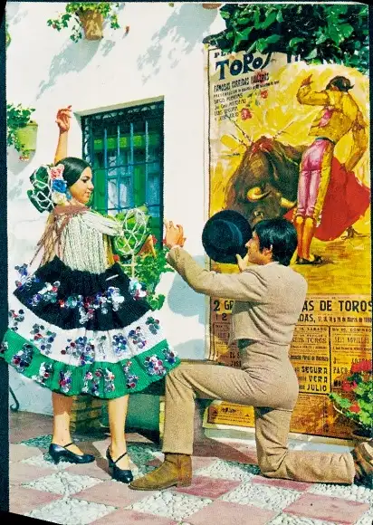 Stoff Ak Spanische Tracht, Mann kniet vor einer Frau, Torero, Stierkampf
