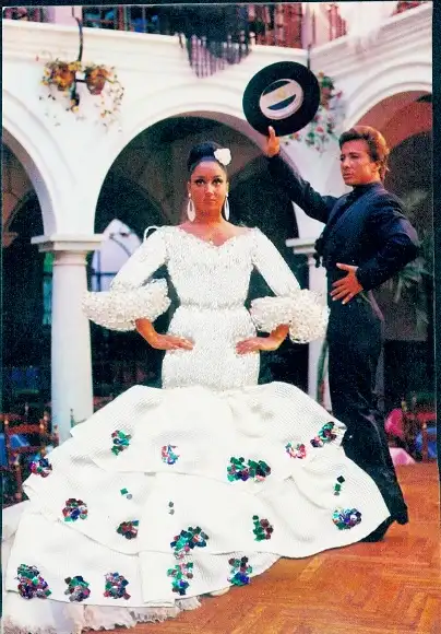 Stoff Ak Spanische Tracht, Tanzpaar, Frau in weißem Kleid