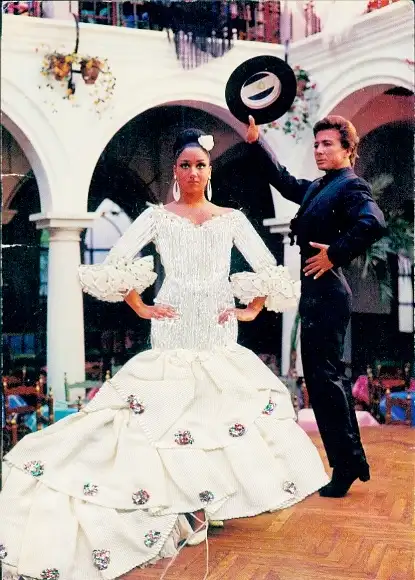 Stoff Ak Spanische Tracht, Tanzpaar, Frau in weißem Kleid