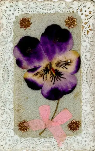 Stoff Ak Stiefmütterchen, Klöppelwerk, Schleife