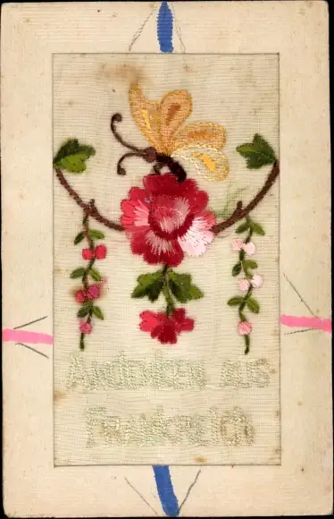 Stoff Ak Strick-Blume, Schmetterling, Andenken aus Frankreich