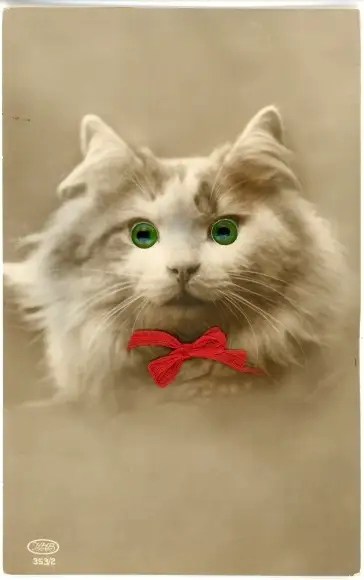 Stoff Ak Weiße Katze mit Plastikaugen, Tierportrait, Rote Stoff-Schleife