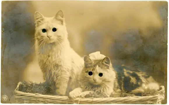 Stoff Ak Zwei Katzen im Korb, Plastik-Augen, Katzen-Portrait