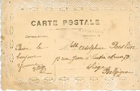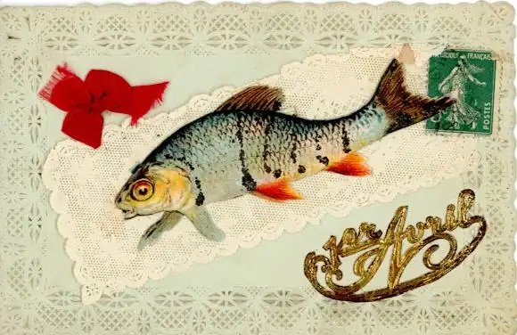 Stoff Glitzer Ak 1. April, Fisch auf einer Spitzendecke