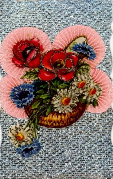 Stoff Glitzer Ak Blumen im Korb, Margeriten, Rosen