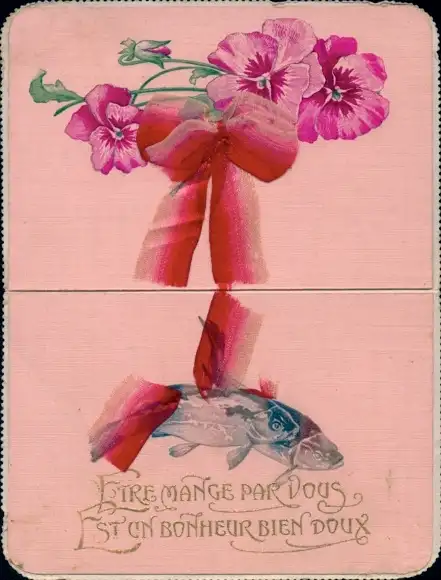 Stoff Klapp Ak Kitsch, Fische, Blumen, Stoffschleife