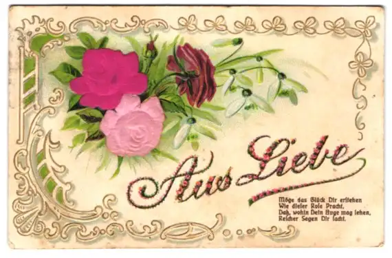 Stoff-Präge-AK Aus Liebe, Rosenblüten aus echtem Stoff
