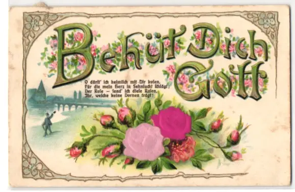 Stoff-Präge-AK Behüt Dich Gott, Rosen aus echtem Stoff