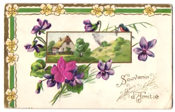 Stoff-Präge-AK Bild eines Hauses umrandet mit Blüten aus echtem Stoff