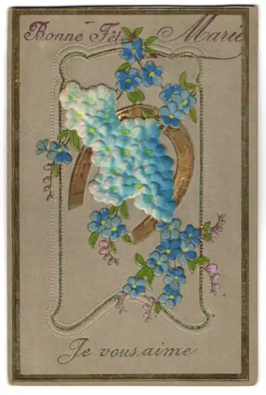 Stoff-Präge-AK Blaue Blumen aus Stoff, Bonne Fete Marie, Je vous aime