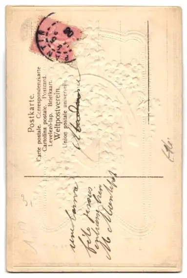 Personenbezogene Daten auf der Rückseite der Karte wurden durch blauen Textmarker unkenntlich gemacht. Die blauen Stellen sind auf die Vorderseite durchgeweicht und wirken sich negativ auf das Postkartenfoto aus