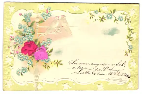 Stoff-Präge-AK Blühende Blumen und Vögel