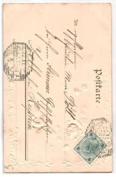 Personenbezogene Daten auf der Rückseite der Karte wurden durch blauen Textmarker unkenntlich gemacht. Die blauen Stellen sind auf die Vorderseite durchgeweicht und wirken sich negativ auf das Postkartenfoto aus