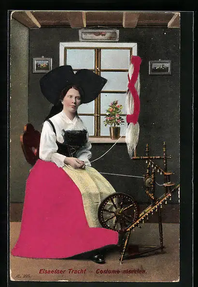 Stoff-Präge-AK Frau in elsass-lothringischer Tracht am Spinnrad