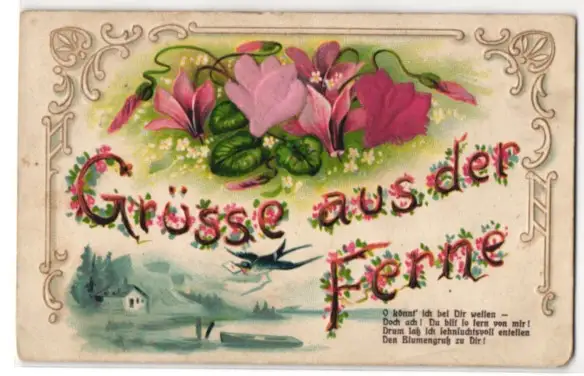 Stoff-Präge-AK Grüsse aus der Ferne, Alpenveilchen aus echtem Stoff