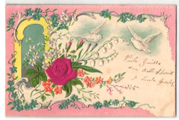 Stoff-Präge-AK Rose aus echtem Stoff mit weissen Tauben und Maiglöckchen