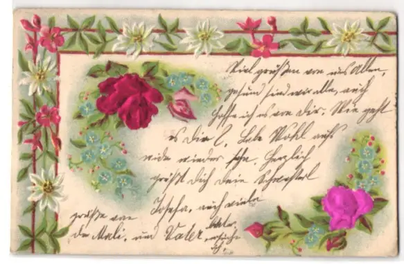 Stoff-Präge-AK Rosen aus echtem Stoff und Vergissmeinnicht