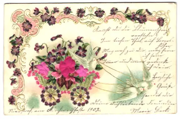 Stoff-Präge-AK Tauben ziehen Wagen voller Blumen aus Stoff
