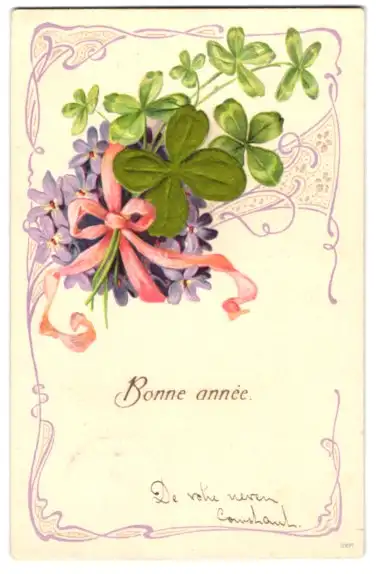 Stoff-Präge-AK Veilchenstrauss mit Kleeblättern aus Stoff