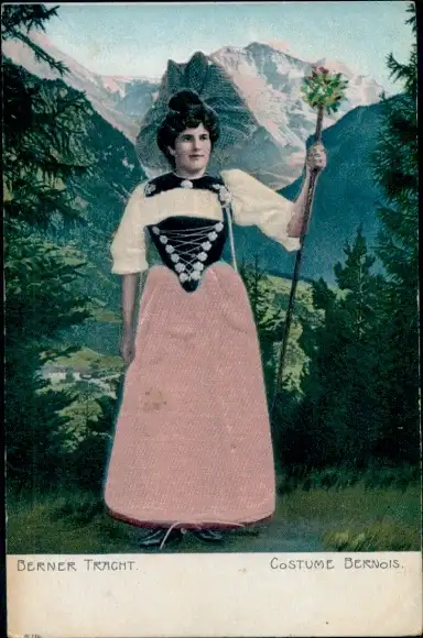 Stoff Präge Ak Frau in Berner Tracht, Porträt, Gebirge