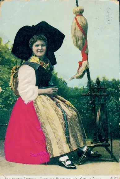 Stoff Präge Ak Frau in Elsässer Tracht beim Spinnen, Spinnrad