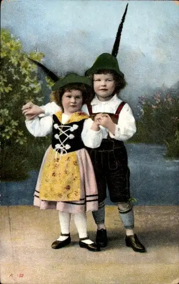 Stoff Präge Ak Junge und Mädchen in bayrischen Trachten