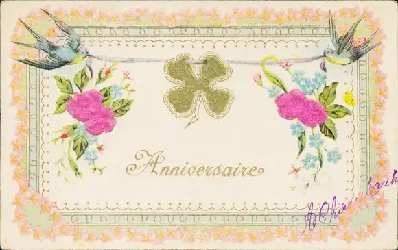 Stoff Präge Ak Kitsch, Schwalben, Blumen, Glücksklee