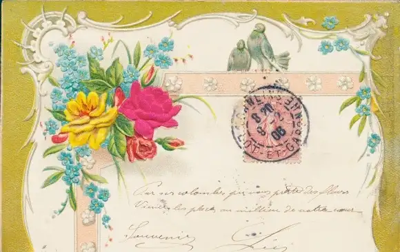 Stoff Präge Ak Rosen, Vergissmeinnicht, Blumen, Vögel