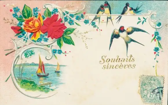 Stoff Präge Ak Schwalben, Rosen, Segelboote, Kitsch