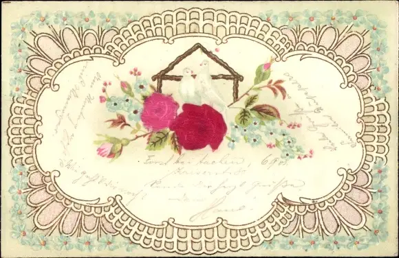 Stoff Präge Litho Rosen, Tauben, Vergissmeinnicht, Kitsch