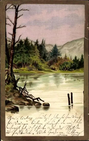 Stoff ak Partie am Wasser, Im Hintergrund Wald und Berge