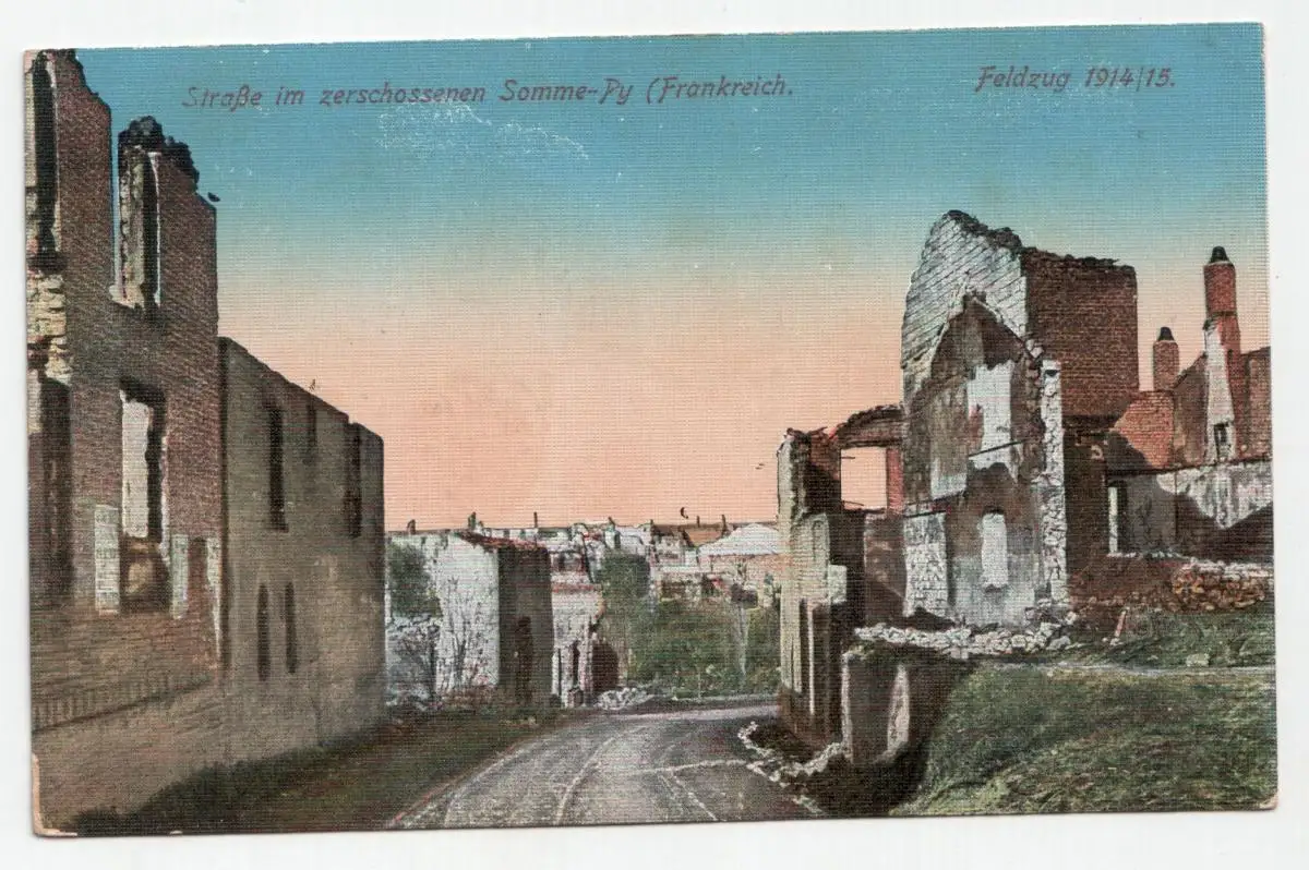 Straße im zerschossenen Somme-Py (Frankreich). Feldzug 1914/15 // Feldpost 1916