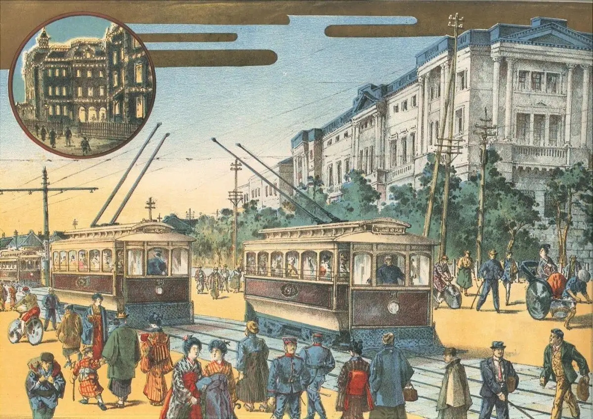 Bemerkungen: Lebendige Straßenszene mit Passanten und Straßenbahn in Tokyo in der Zeit während des Russisch-japanischen KriegesText in japanisch. Lively street scene of Tokyo with pedestrians and tramway during the time of the Russo-Japanese war.