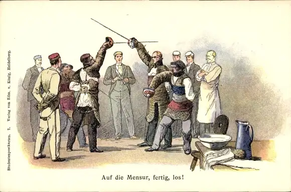 Studentika Ak Auf die Mensur, fertig, los, Studenten beim Fechtkampf