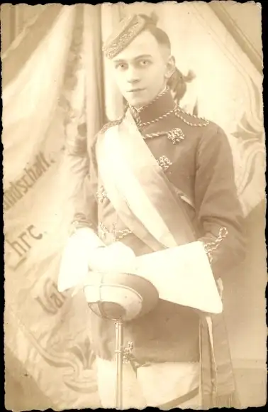 Studentika Foto Ak Student in Uniform, Mütze, Degen, Standarte