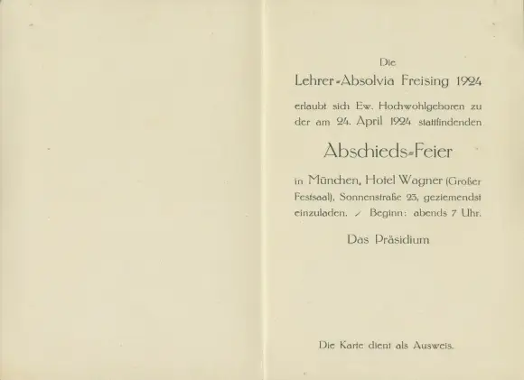 Studentika Klapp Ak Freising in Oberbayern, Lehrer Absolvia 1924, Einladungskarte