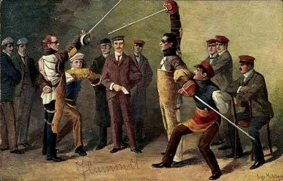 Studentika Künstler Ak Mühlberg, Georg, Auf die Mensur