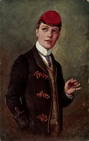 Studentika Künstler Ak Mühlberg, Georg, Im ersten Semester, Student mit Zigarette