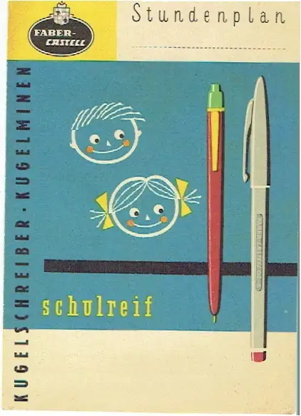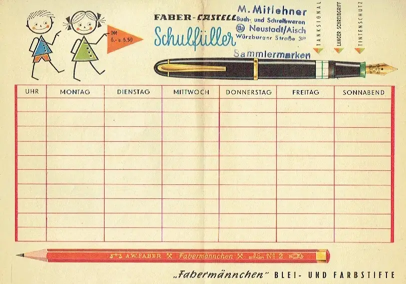 guter Zustand, geringe Gebrauchs- und Alterungsspuren: Ecken teils etwas eselsohrig bzw. knittrig - innen mit altem Händlerstempel, Faber-Castell-Kugelschreiber-Werbung, Papier, ca. 10,5 x 14,8 (aufgeklappt ca. 21 x 14,8), 4 Seiten