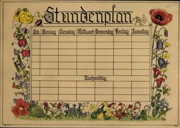 Stundenplan Blumen, Mohnblume, Glockenblume um 1930
