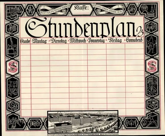 Stundenplan Singer Nähmaschinen, Wittenberge Bezirk Potsdam, Datentabellen um 1920