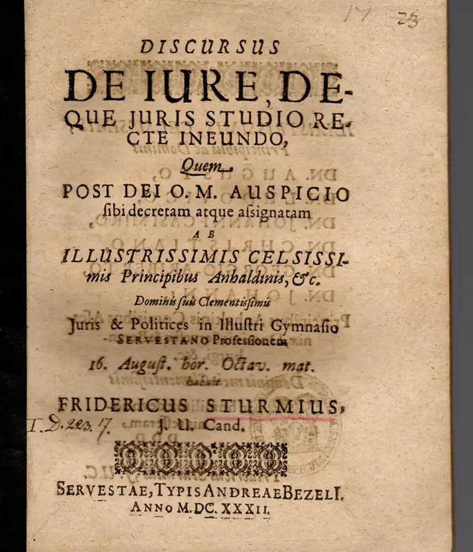 Disputatio am Gymnasium illustre (Anhaltische Landesuniversität): 1632-08-16; Beiträger: G.A.R. Wendelin (Rektor), Peter von Jena, Johann Sagittarius, Daniel Ludwig, Balthasas Wircker; 26 Bl., 18 x 15 cm, Deckblatt mit Vignette, ornamentale Schlussvignette, Bibliotheksstempel, Lichtrand, Deckblatt mit handschr. Markierungen, Seiten papierbedingt leicht gebräunt, leicht stockfleckig.