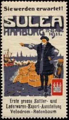 Erste grosse Sattler- und Lederwaren - Export - Ausstellung. Signatur, Fahrrad, Größe/Zustand: 6x4 , guter Zustand, Original alte Reklamemarke die seinerzeit für die Werbung benutzt wurde