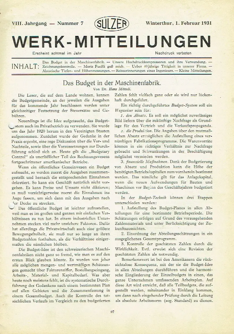guter Zustand, geringe Gebrauchs- und Alterungsspuren: gelocht - Papier teils etwas vergilbt, aber Seiten überwiegend sauber und ordentlich - obere Ränder teils mehr oder weniger wasserfleckig, Das Budget in der Maschinenfabrik. — Unsere Hochdruckkompressoren und ihre Verwendung. — Zeichnungskontrolle. — Moriz Fueßli goß mich. — Ueber 40jährige Tätigkeit in unserer Firma. — Akustische Tiefen- und Höhenmessungen. — Reiseerinnerungen eines Ingenieurs. — Kleine Mitteilungen, Softcover, ca. 21 x 29,5, 16 Seiten mit 10 Bildern