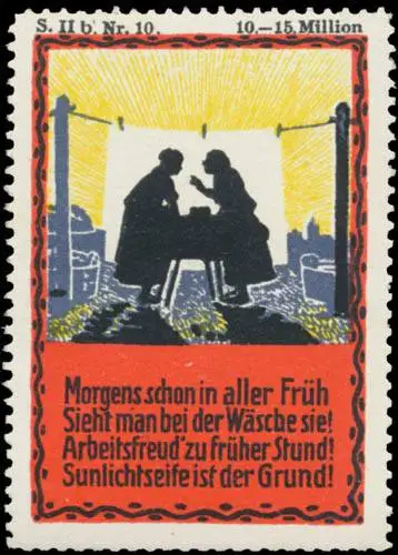 Morgens schon in aller Früh sieht man bei der Wäsche sie! Arbeitsfreud zu früher Stund! Sunlichtseife ist der Grund!, Größe/Zustand: 5x4 , guter Zustand, Original alte Reklamemarke die seinerzeit für die Werbung benutzt wurde